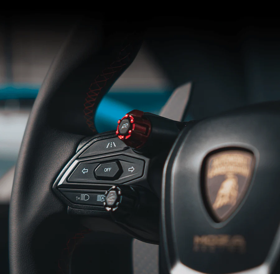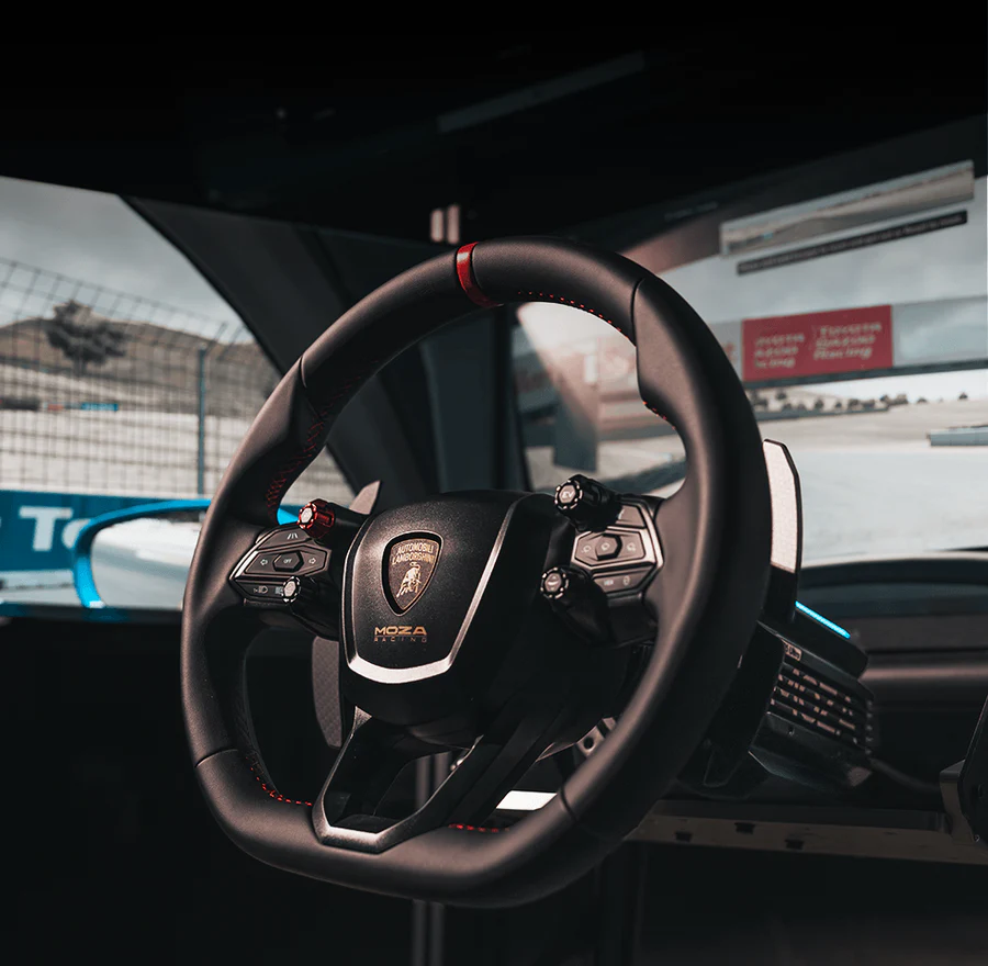 Hivatalosan licencelt Lamborghini Revuelto kormánykerék, eredeti CAD adatokból aprólékosan újraalkotva, alumínium kerettel, szénszálas dupla kuplungos kormányfülekkel és teljesen programozható kezelőszervekkel.