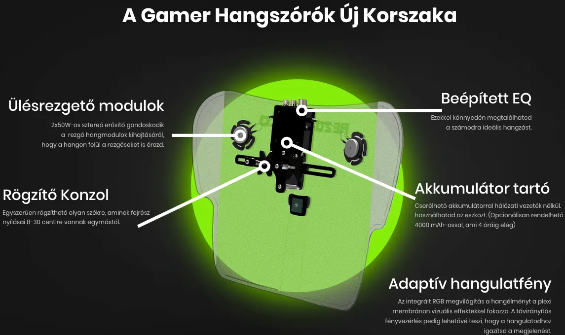 Ülésrezgető modulok: 2x50W-os sztereó erősítő gondoskodika rezgő hangmodulok kihajtásáról,hogy a hangon felül a rezgéseket is érezd.