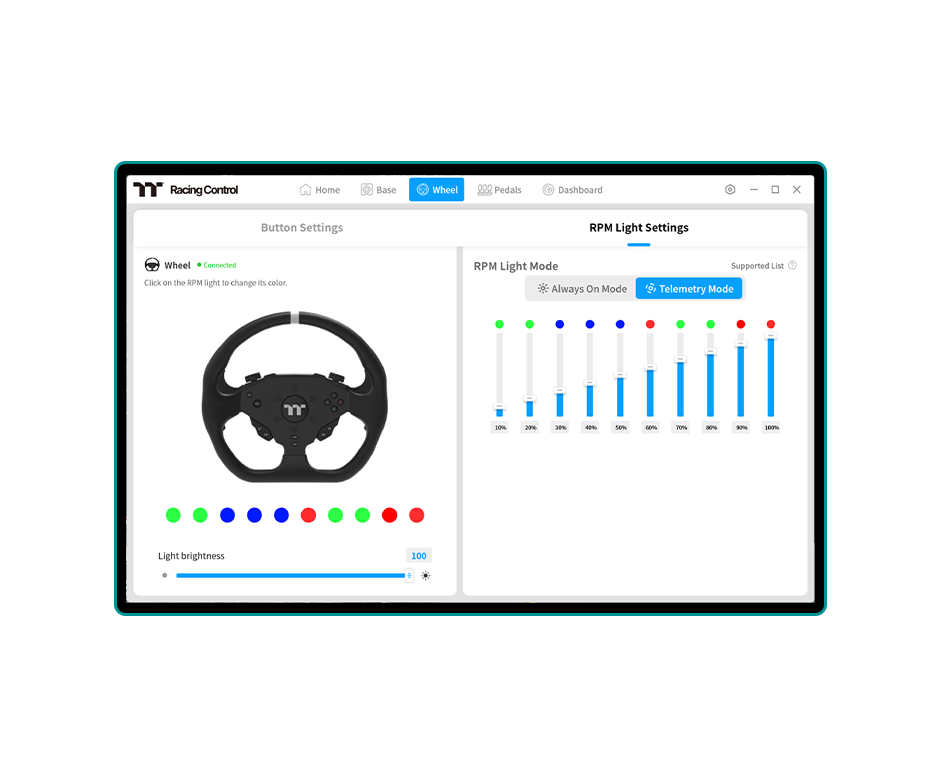 A kormánykerék 10 teljesen testreszabható LED-lámpával van felszerelve, amelyek valós idejű fordulatszám-visszajelzést adnak, lehetővé téve a vezetők számára, hogy egy pillantással ellenőrizzék a motor teljesítményét. Ez fokozza az immerziót és segít javítani a reakcióidőket a sebességváltások során, versenyelőnyt biztosítva a versenyzőknek a nagy sebességű vezetési helyzetekben.